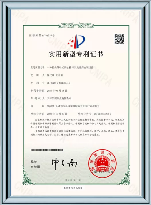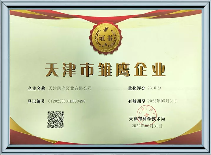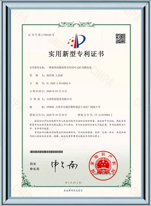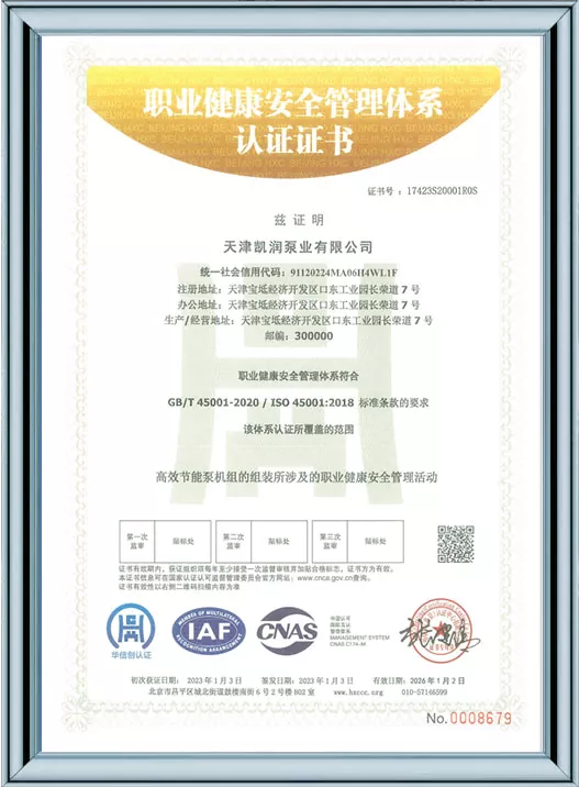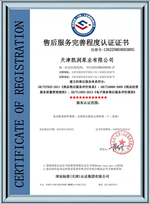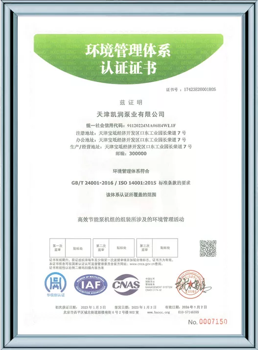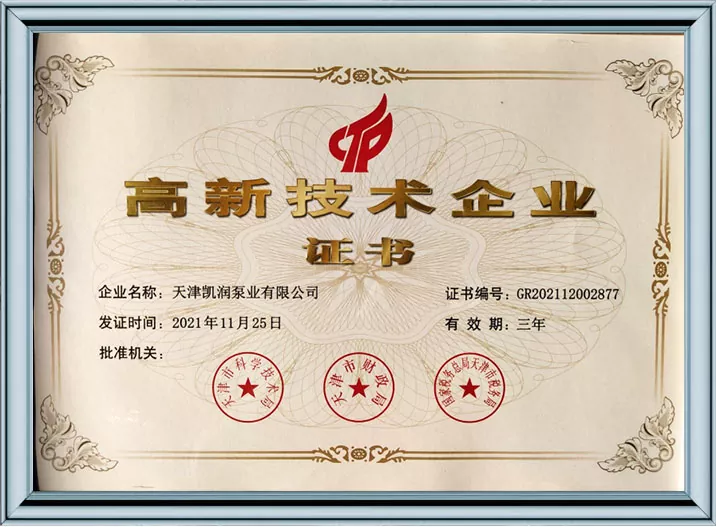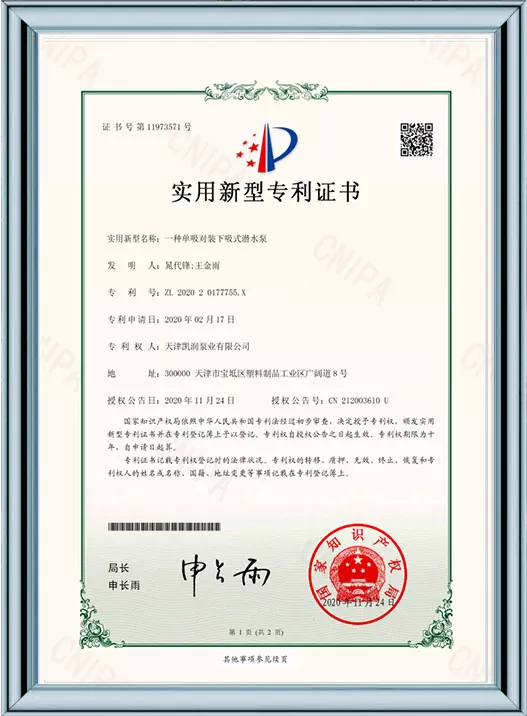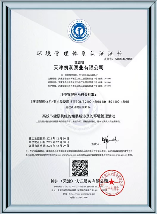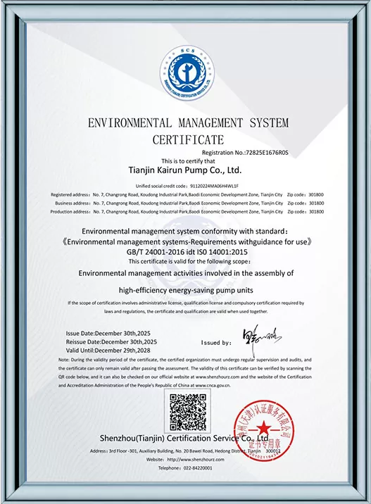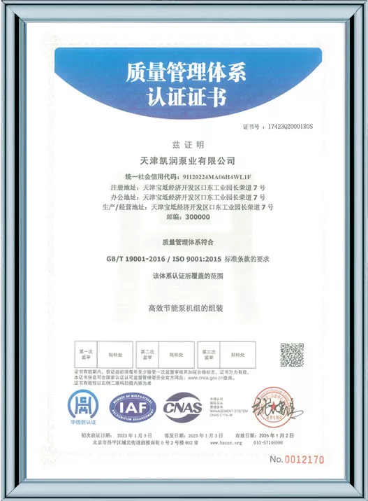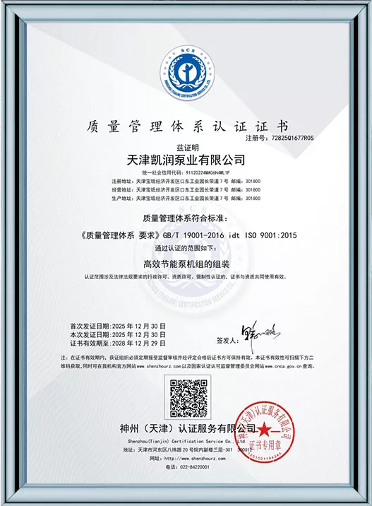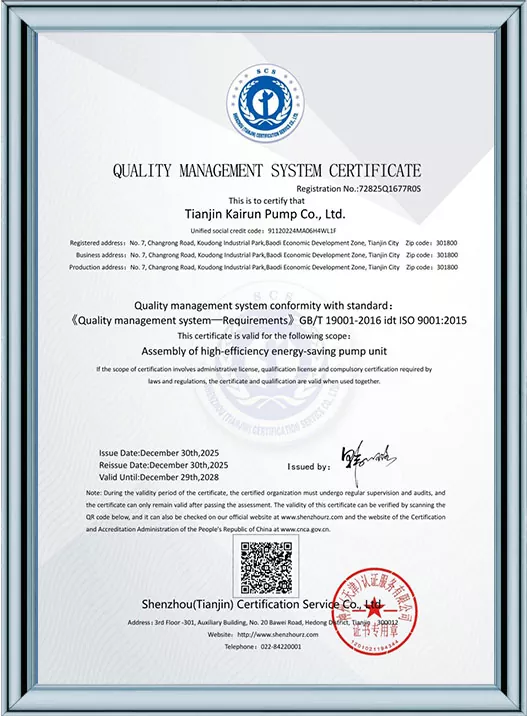 Ang Kairun Pumps ay lubos na nakatuon sa teknolohikal na pagbabago at standardized na pamamahala, na nakakuha ng 41 utility model patent at kinilala bilang isang High-Tech Enterprise at isang Tianjin Young Eagle Enterprise. Sa pamamagitan ng pagpasa ng maraming awtoritatibong sertipikasyon kabilang ang ISO9001 na pamamahala sa kalidad, pamamahala sa kalusugan ng trabaho, pamamahala sa kapaligiran, at komprehensibong serbisyo pagkatapos ng pagbebenta, ipinapakita ng Kairun Pumps ang lakas nitong nangunguna sa industriya at nakuha ang tiwala ng mga pandaigdigang customer gamit ang matatag nitong portfolio ng patent at komprehensibong mga kwalipikasyon sa pagsunod!